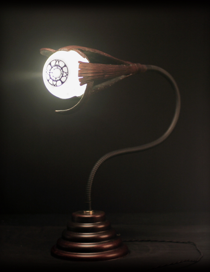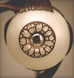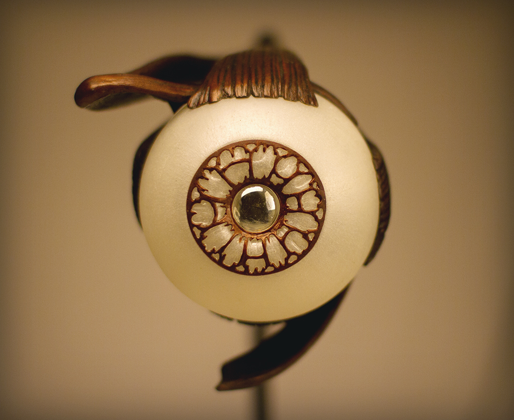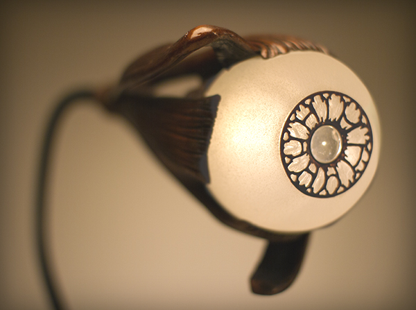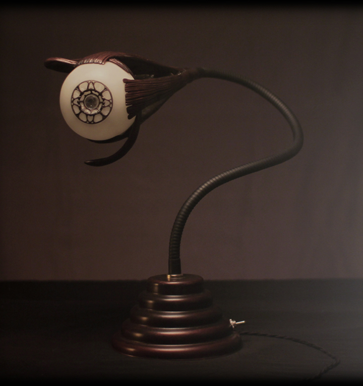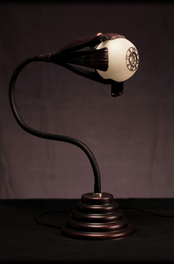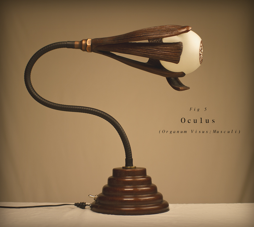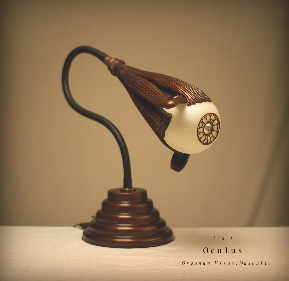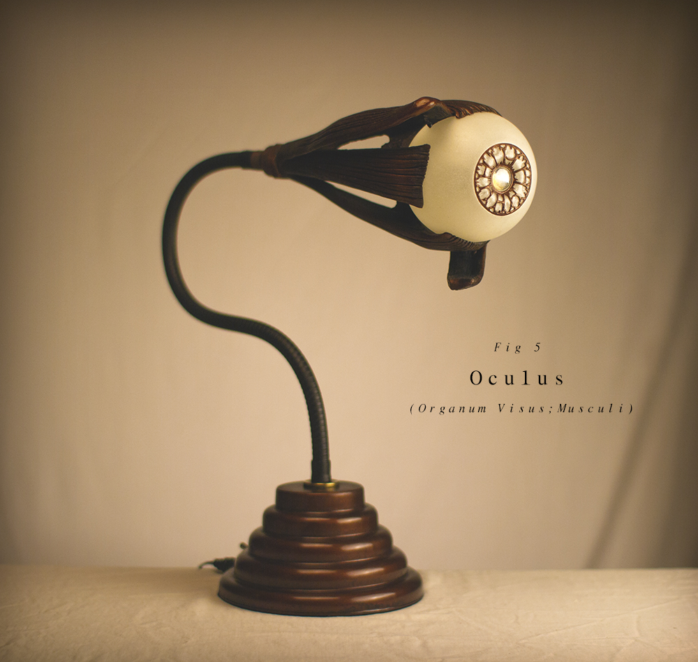 Muscles of the human eye in cold-cast bronze and marble-cast resin. Illuminated Eyeball with lens reading light pupil in opal glass. 12v LED .